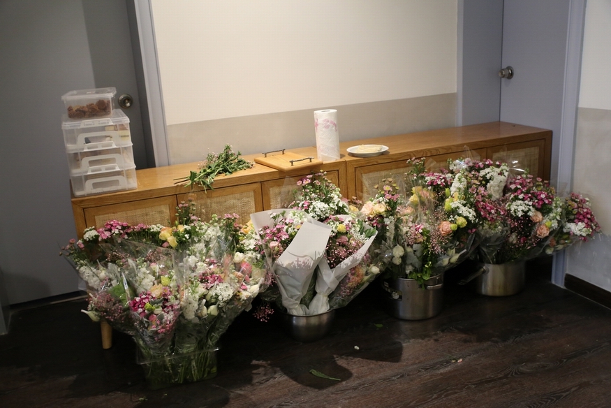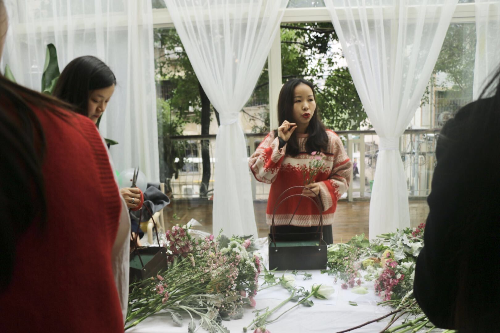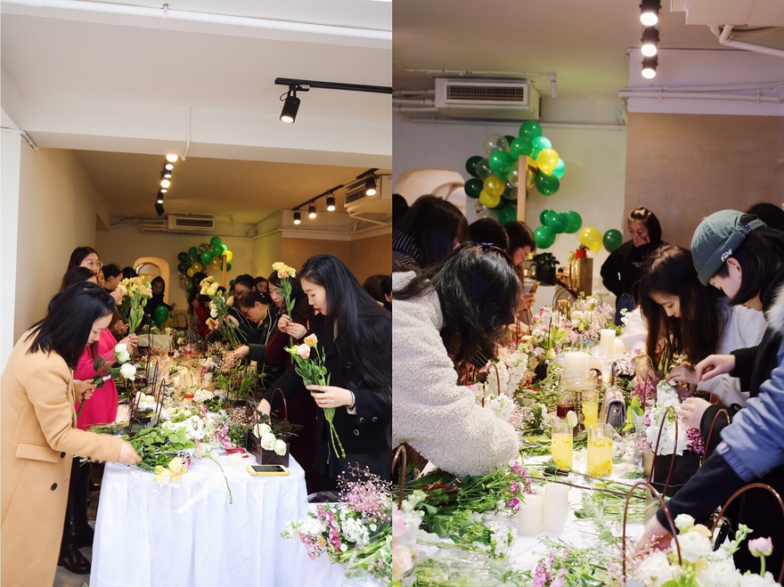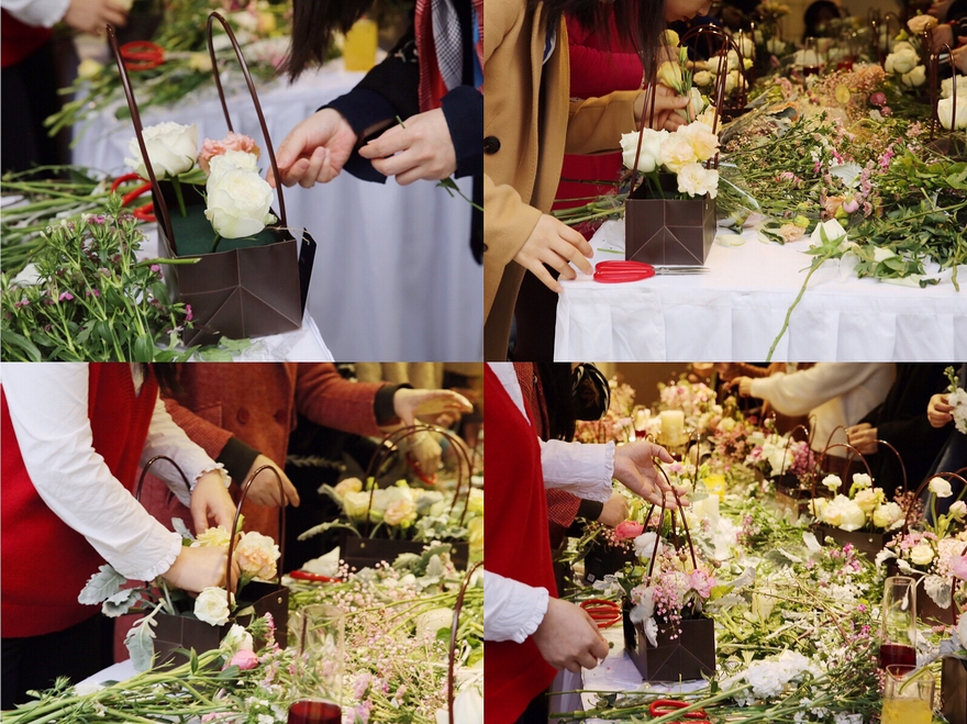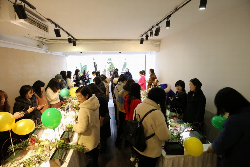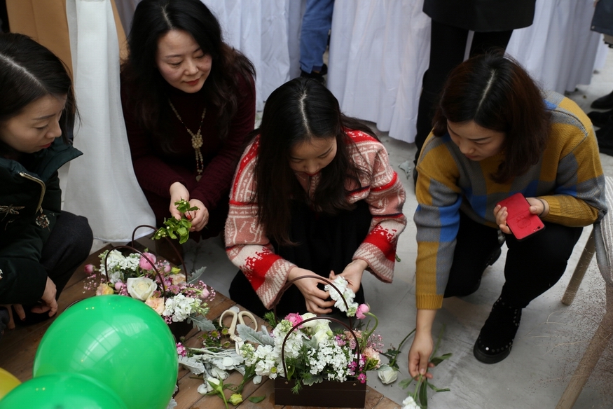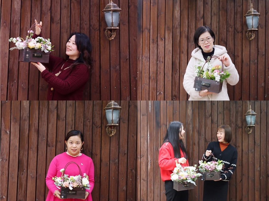 在花艺环节,聘请了专业的花艺老师授课,教大家识别常用花种,讲述插花步骤与诀窍,女员工们根据老师讲授的步骤进行实践插花。