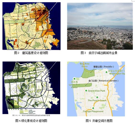 其中,在建筑高度控制方面,旧金山城市设计制定了严格的建筑高度管理规定,将高层建筑集中在主要交通干线和港口区域围合的东北部城市中心地段,外侧则呈圈层式逐级降低高度,从而突出了核心CBD区域的空间体量(图2)。如今,从双子峰(Twin Peaks)鸟瞰城市,旧金山依然严格保持了当年规划所确定的高度分区,形成了一览无遗、错落有致的城市天际线(图3)。 在绿化控制和开敞空间布局方面,旧金山城市设计基于当时的行道树和景观资源,对政府或私人等不同的建设主体中,制定不同的绿化建设准则要求(图4)。通过几十年的管理,逐渐形成了旧金山市清晰的绿色开敞空间脉络,即使在导航地图上都能看出金门公园(Botanical Garden)、要塞公园(Presidio)等组成的城市绿色主体骨架(图5)。