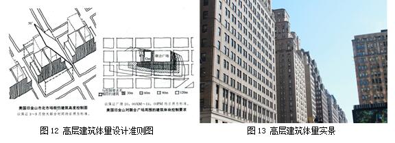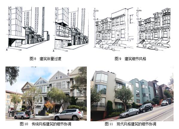 微观层面,旧金山城市设计从建筑细部控制和建筑体量控制两方面阐述了城市设计要求。在建筑细部控制中,该城市设计在建筑风格延续、体量统一等方面制定了一系列微观城市设计准则(图8、图9),指导形成了旧金山市区街道,尤其是在亲人的低层街道空间上统一协调的建筑风格和色彩(图10、图11)。在建筑体量控制方面,旧金山城市设计制定了详细的建筑体量控制导则(图12)。在建设中,高层建筑大多采用了顶部退台的设计(图13),形成以裙房统一为主的街道风貌和以顶部退台为主的仰视视线感受。 由此说明,塑造好的城市风貌不仅离不开城市设计在宏观、中观、微观等各个层面所确立的城市建设骨架、格局与要求,更有赖于城市设计的要求被严格执行和落实。